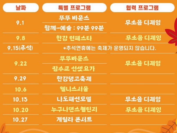 잠수교 뚜벅뚜벅 축제에 특별한 프로그램들은 인기가 많아서 빨리 마감이 되고 예약을 안하시면 참가하실수 없습니다.