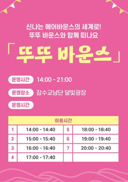 2024 차 없는 잠수교 뚜벅뚜벅 축제에서 뚜뚜바운스와 함께 하는 즐겁고 신나는 시간 즐기실 수 있습니다.