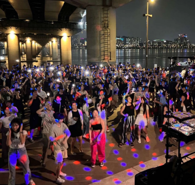 아름다운 서울 한강 야경을 배경으로 즐기는 댄스파티로 무선헤드폰을 통해 DJ가 틀어주는 음악을 들으면서 춤을 추며 노래를 부르는 이색적인 파티입니다.