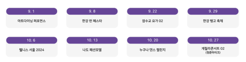 기간 : 9. 8(일) / 9.22(일) / 10.12.(토 )/ 10.13(일) / 10.19(토) / 10.2 (일)