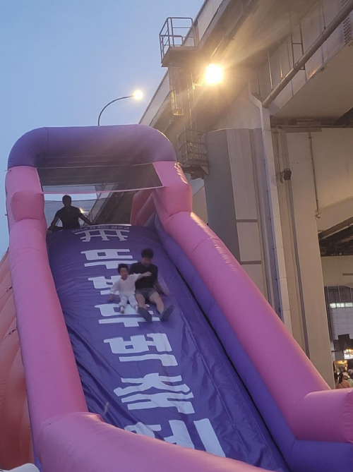 2024 차 없는 잠수교 뚜벅뚜벅축제에서 모두가 즐길 수 있는 특별 프로그램으로 만 5세이상을 위한 슬라이드와 장애물 바운스 놀이시설입니다.