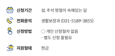 | 중량구 | 기초생계· 의료급여 수급자 가구에 서울시에서 부가적으로 명절위문비 | ➡️ 바로가기 |