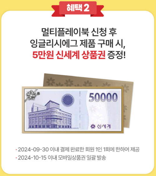 혜택2 멀티플레이북 신청 후 잉글리시에그 제품 구매 시, 5만원 신세계 상품권 증정