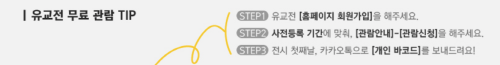 STEP2 사전등록 기간에 맞춰서 관람안내 > 관람신청(등록) 메뉴에서 관람신청을 해 주세요.