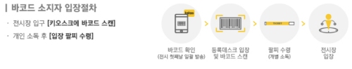 전시장 입구의 키오스크에서 바코드를 스캔합니다.